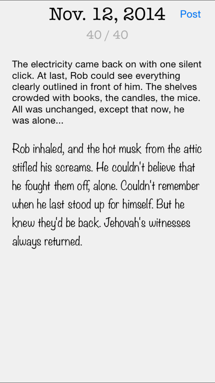 I was going through my phone apps and tried to login to an old one called, Write Now! It gave you the beginning of a story and a set number of words to finish it in. Unfortunately it’s not working anymore, which blows the big bubble because it was a really fun app. I deleted it but saved this story I wrote because I thought it was nice.